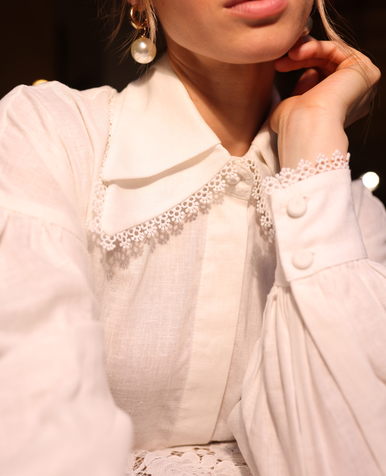 La camisa Orianne es una camisa elegante y formal que destaca la sutileza y feminidad. El cuello incorpora un detalle en giupiur que añade un toque distintivo y refinado al diseño, mientras que el frente limpio y minimalista mantiene una estética elegante y versátil.Sus mangas amplias y puños ajustados, lo que aporta volumen y un aire sofisticado.