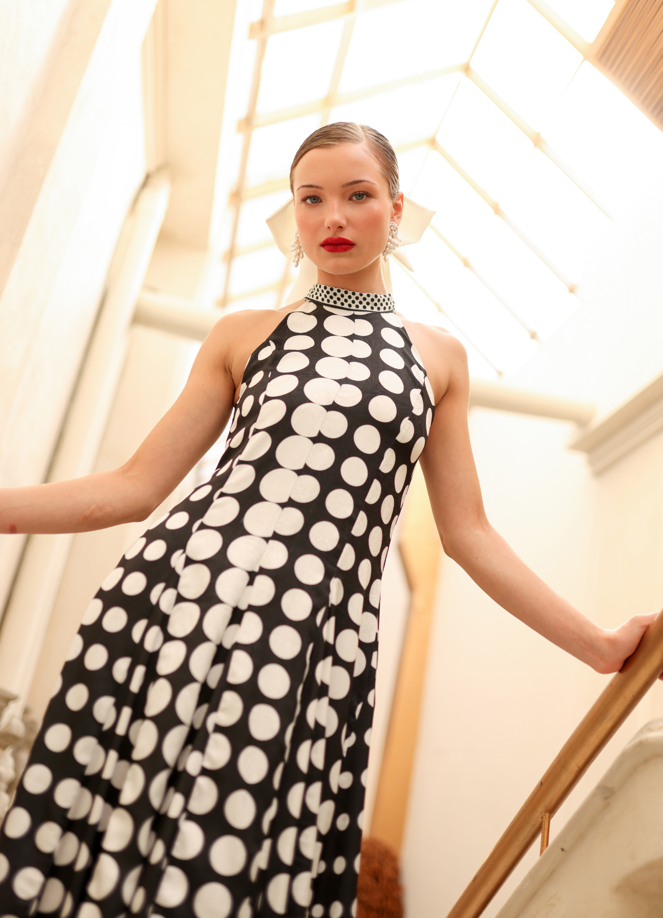 Vestido maxi con cuello halter, es manga sisa con silueta semi ajustada. La falda es linea A con cortes como especie de quillas.